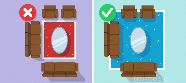 Proper placement of your carpet will add to the overall attractiveness of your apartment. Sometimes it’s enough to move your furniture a bit closer together. By the way, the room will look larger if you decorate it with a soft-tone single-color carpet without texturized patterns.