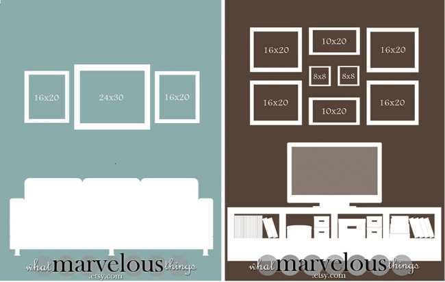 It’s important not only to hang pictures evenly, but also to place them properly — then your wall will look not like a set of separate images, but a completely composed arrangement.