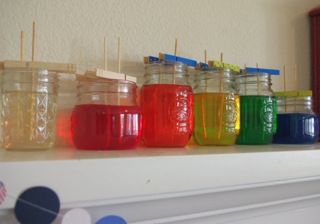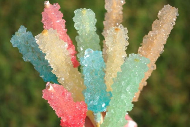 Leave the sticks to dry out overnight. In the morning, dissolve five glasses of sugar in two glasses of water in a heated saucepan. Leave the resulting syrup to cool down for 15 minutes, although not for too long as otherwise the crystals won’t form. Then pour it into some empty jars and add food colouring in different colours. Place the now-ready kebab sticks in the jars, but make sure they touch neither walls or bottom — use a clothes peg to do this.
