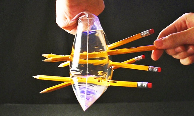Explanation: If you pierce the bag with the pencils and only then pour in the water, it will seep out through the holes you’ve made. But if you fill it first and then insert the pencils, the water will not seep out at all. This is a result of the fact that when the polyethylene is broken apart it’s molecules move closer together. In this case, the polyethylene tightens around the pencils.