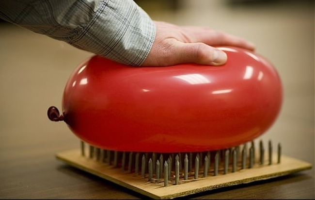 The experiment: If you take an inflated balloon and put it on just one pin or nail — as expected, it’ll pop. However, if you take a handful of pins and lay them out flat and then take another balloon trying to do the same thing again, this time you can push the balloon down onto the pins and it won’t burst. A bed of nails can substitute the pins. You can even put a brick on the balloon (but do not to push too hard).
