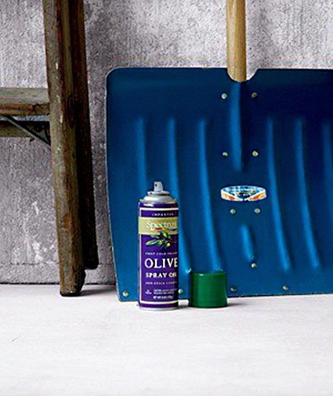 Liberally apply olive oil spray to your plastic or metal shovel before shifting snow to avoid a buildup of rock hard ice.