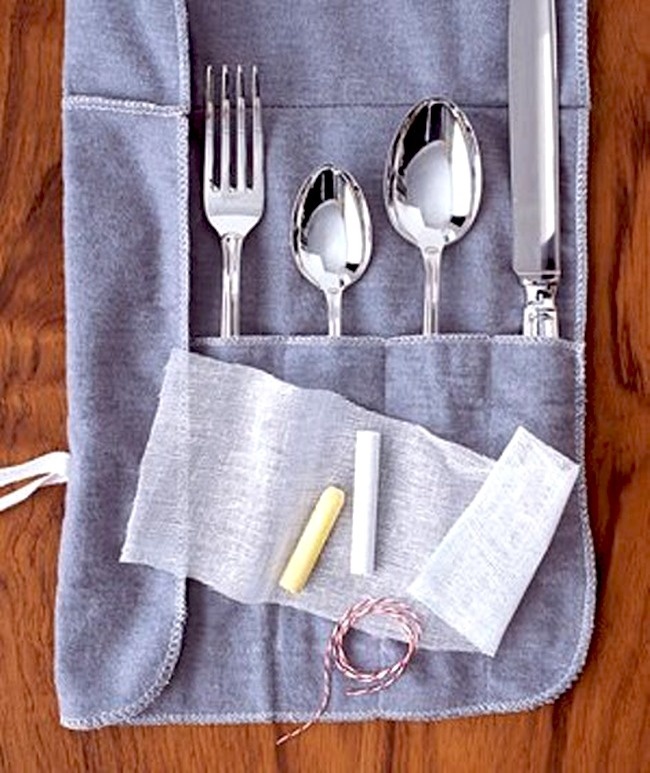 Wrap two bits of chalk in some cheesecloth, and add them to your silverware. This will slow any tarnishing!