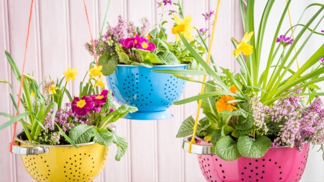 2. Turning a colorful colander into a flower basket