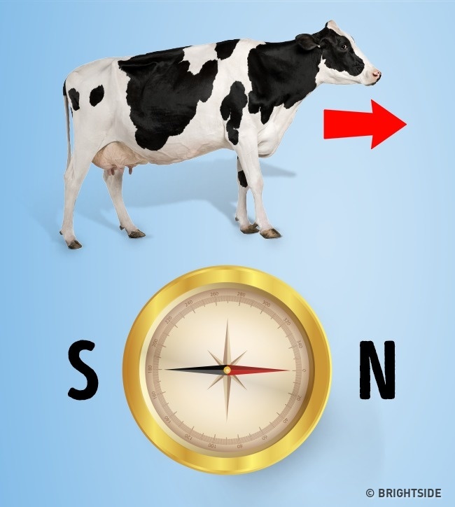 Using Google Earth, scientists studied thousands of grazing cows’ images and discovered a strange pattern. 70% of cows turn their heads to the north or south while eating or drinking. This is observed on all continents, regardless of terrain, weather, and other factors.