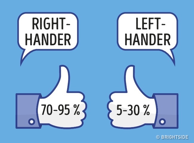 Most humans (70% to 95%) are right-handed, and a minority (5% to 30%) are left-handed. An indeterminate number are ambidextrous.