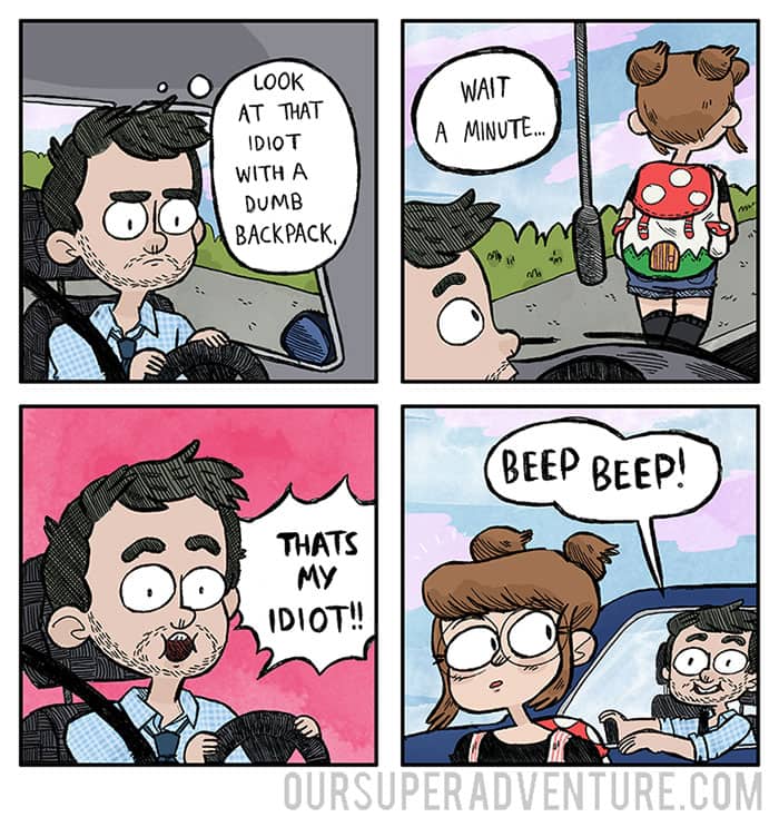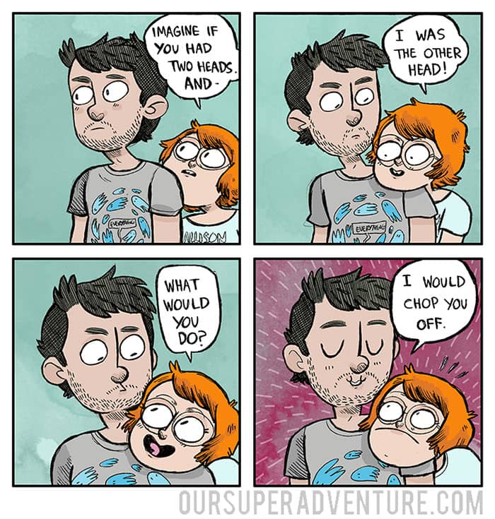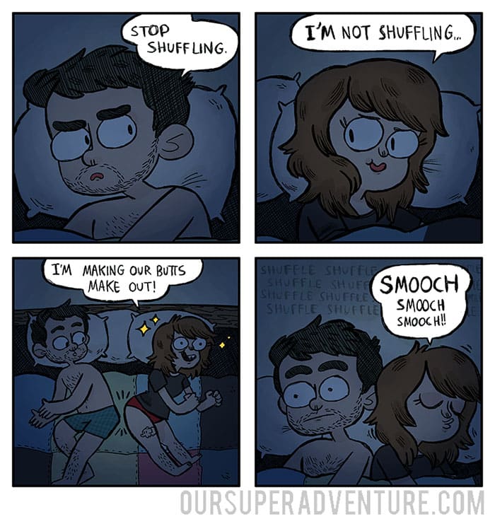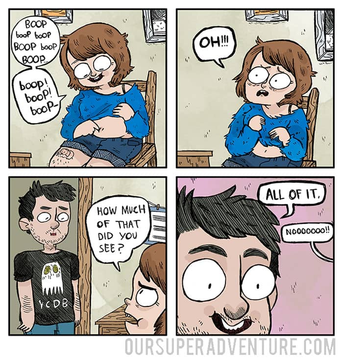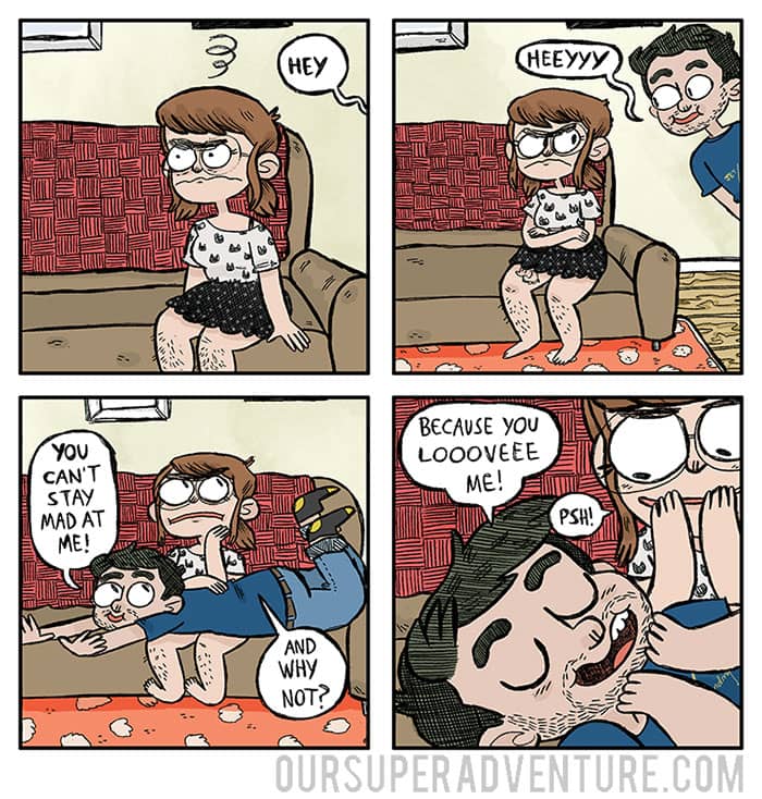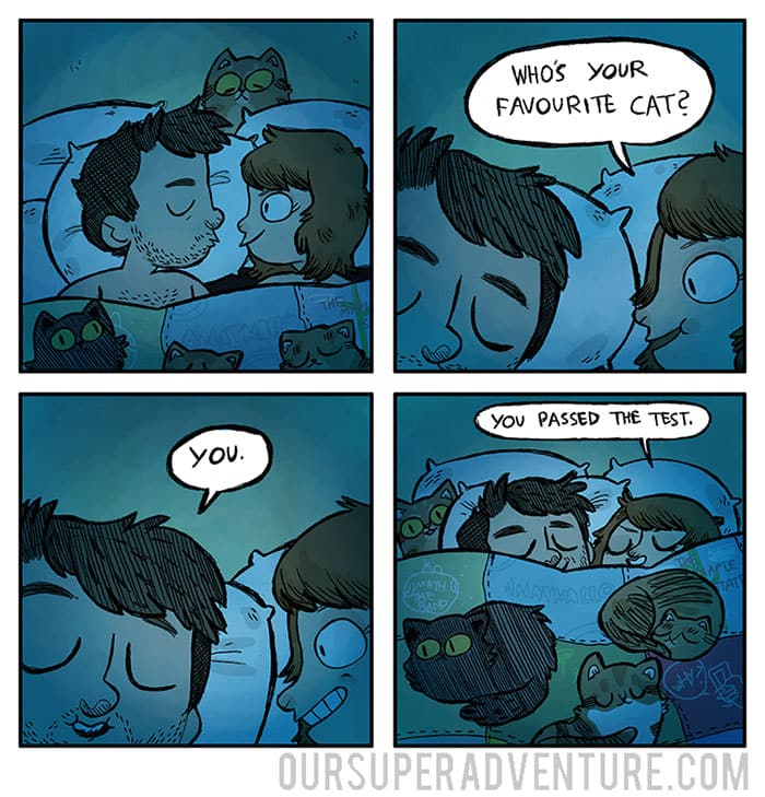 Sarah Graley, an artist based in Birmingham, UK, has created a humorous series that follows her life with her “cat-like” boyfriend and their four cats Pesto, Toby, Pixel, and Wilson. Our Super Adventure finds comedy in everyday mundane situations that we’ve all been through now and again.