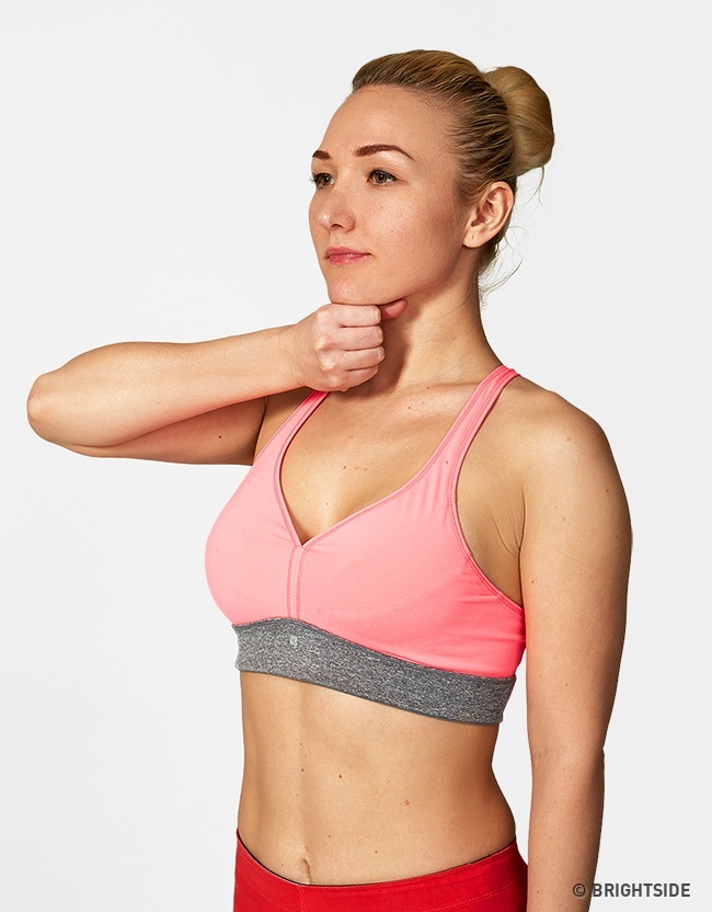 Stand half a meter away from a wall, stretch your arms out in front of you, and begin to press against it with your fists. You’ll feel your pectoral muscles being exercised. Press for 20 seconds, then rest for 10 seconds. Repeat 3 times.