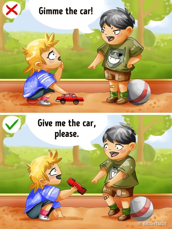 The earlier you start teaching your child politeness, the better. However, some understand it easily while others won’t get it the first time. Show your child the magic of polite words: don’t do anything they ask until they say “please.“ Say ”hello,“ “bye,” and ”thank you” first without waiting for your child to remember.