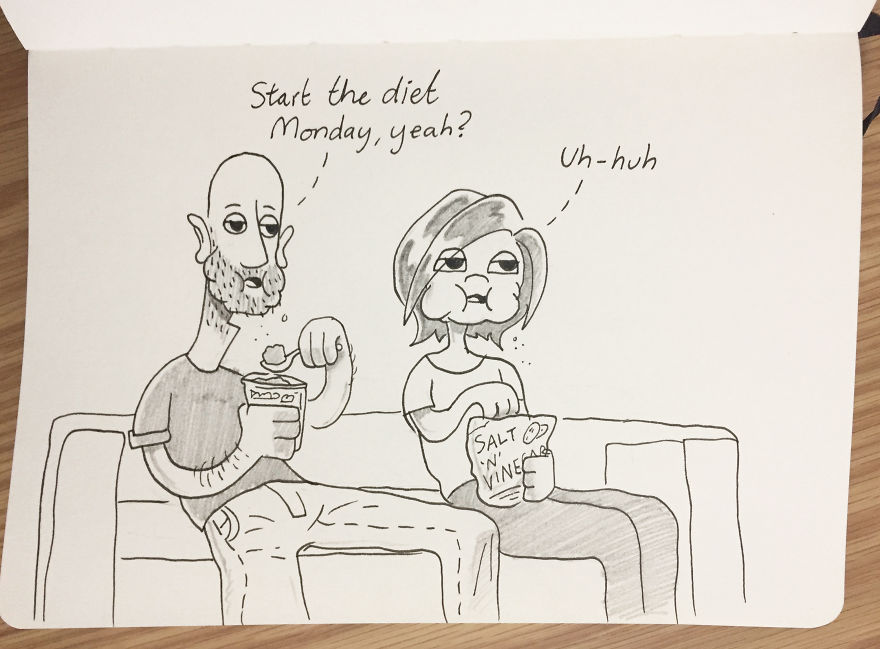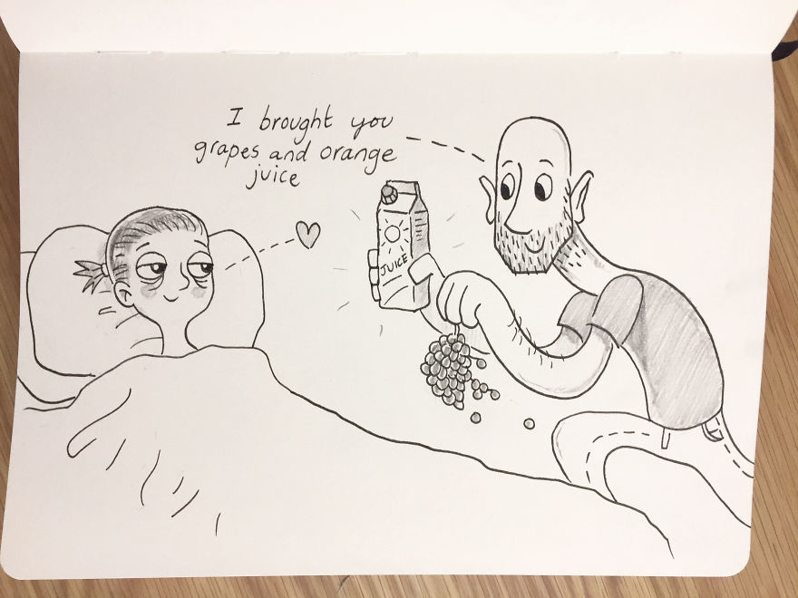 Hello, my name’s Pete and ever since I began dating my partner Kellie 5 years ago I’ve been making her illustrations based on our lives together, to capture the funny things we say and do.