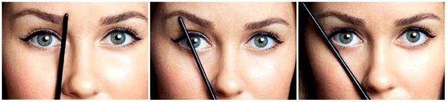 To identify the three points that you will need to look at when shaping your eyebrow, use the ’pencil’ method. Place a pencil in a straight line along the side of your nose — this is going to be the beginning (inside) of the brow. Next, place the pencil along your nose and across your pupil. This will be the arch and the highest part of your brow. Now move the pencil so that the end of your nostril and the outer edge of your eye are in line — this is the end of your brow.