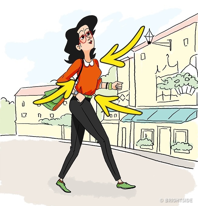 - Watch your posture while walking. Your torso and shoulders should be straight and your stomach sucked in.