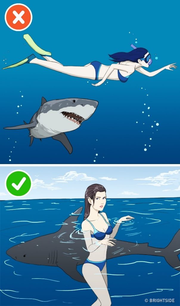 Trying to swim away won’t help in this situation. The correct behavior here will be to slowly move away from the shark’s path, and stay calm. Keep an eye on the shark. When it has passed by you, try to find a way out of the water. However, if you can’t and have to defend yourself, hit it on its gills, eyes, or the tip of its nose.