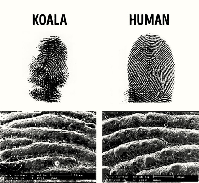Professor Maciej Henneberg from Adelaide University proved there are no differences between the fingerprints of koalas and humans. Even a microscope scanner can’t find them. So it turns out koalas are the only animal, apart from humans, that have unique fingerprint patterns.
