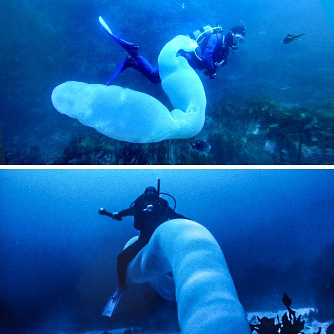 This creature is called a sea unicorn. They’re so rare that they’ve only been seen a few times. A pyrosome looks like a giant transparent and hollow worm, but it actually consists of thousands of organisms that glow in the dark and replicate themselves. They are believed to be able to grow to the size of a blue whale.