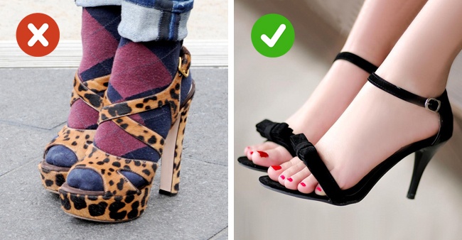 What looks cheap: Open footwear worn in combination with tights or socks.