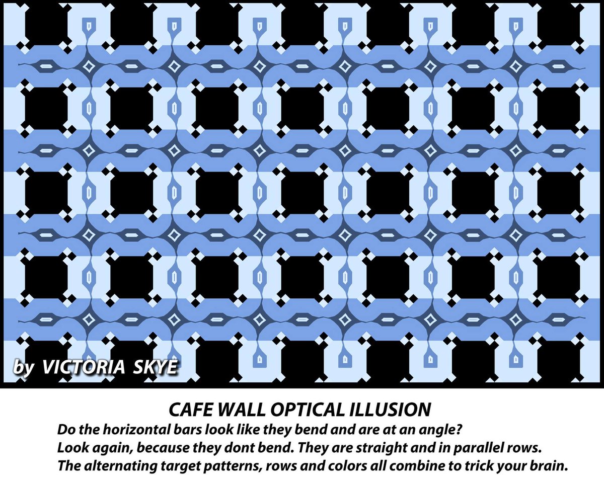 The “café wall” illusion is traditionally “an optical illusion produced by a black and white rectangular tessellation when the tiles are shifted in a zigzag pattern,” according to Wolfram Alpha, which also confirms that “While the pattern seems to diverge towards the upper and lower right corners in the upper figure, the gray lines are actually parallel.” In other words, it’s all about the combination of math and colors, which Skye excellently illustrated in her image.