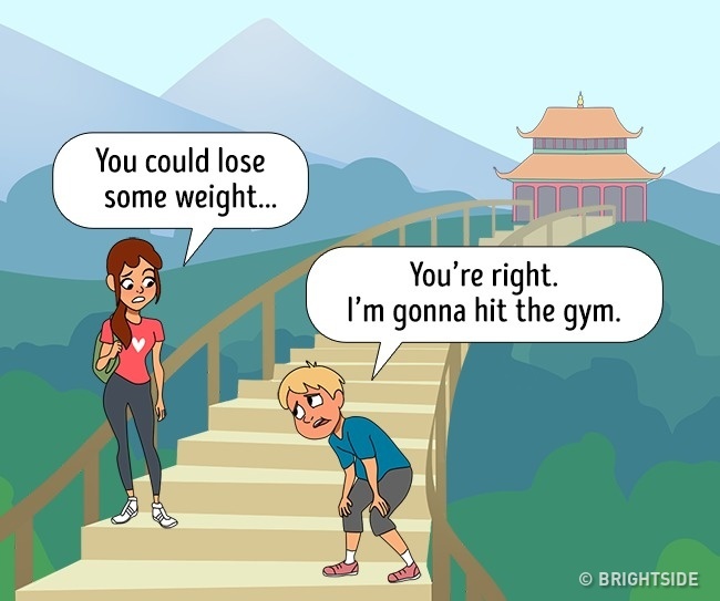 Deep inside, each of us desperately needs compliments to convince ourselves that appearance is not the criterion by which a good person is judged. But if you suddenly gained weight that rendered you short-winded, your partner’s remarks can be attributed to caring about your health rather than wanting to offend you.