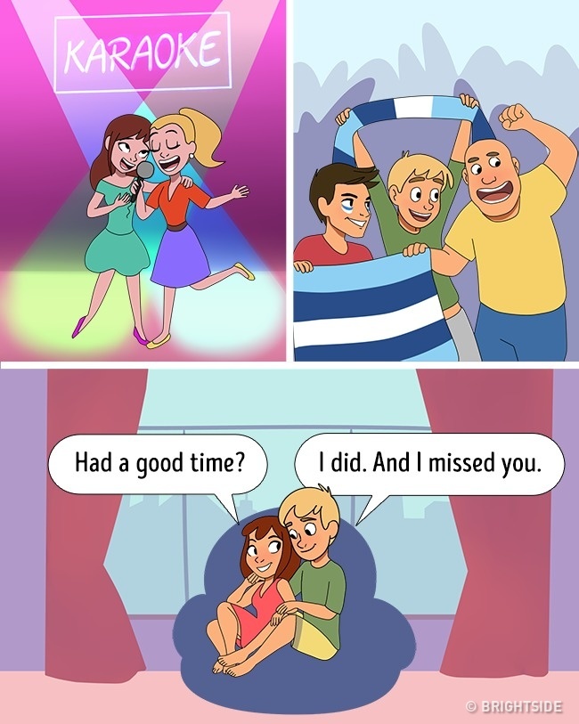 We all have different personalities, interests, and circles of contacts. If your partner is a fan of fishing and a nature enthusiast, while you like bowling and noisy get-togethers, don’t take offense that he doesn’t invite you to come along to the lake. He just remembers how bored you were last time.
