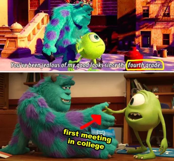 21. In Monsters, Inc., Mike said Sulley had been jealous of him since fourth grade, but how could this be true if they didn’t actually meet until college in Monsters University?