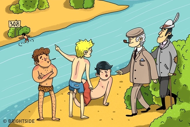 The inspector and his assistant saw swimmers, approached them, and asked, “We are looking for a guy your age. He must be somewhere nearby. Have you seen him?“