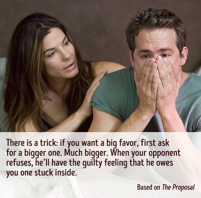 You can tug someone’s feelings of guilt and favor to get what you want. They are most likely to agree to a second, more reasonable request in comparison to a big one you asked for first. Moreover, they might feel obliged and pleased when they help you.