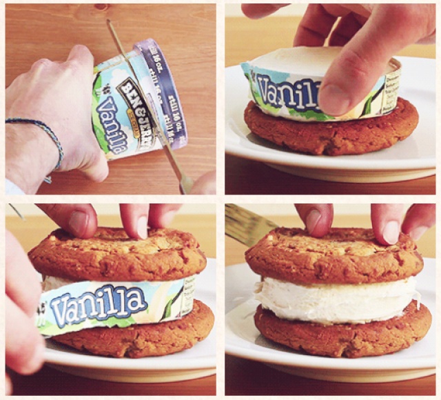 Cut through the tub with the ice cream still inside, place the chunk on a cookie, and cover with another cookie. Voila!