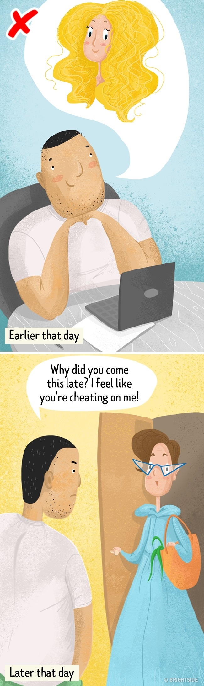 Sometimes people subconsciously project their own thoughts, desires, and feelings onto others. The unfounded feeling of jealousy can be explained by this mechanism. It may provoke serious conflicts when a person doesn’t realize that their partner sees this world differently. It is necessary to comprehend and respect the fact that we all are different people.