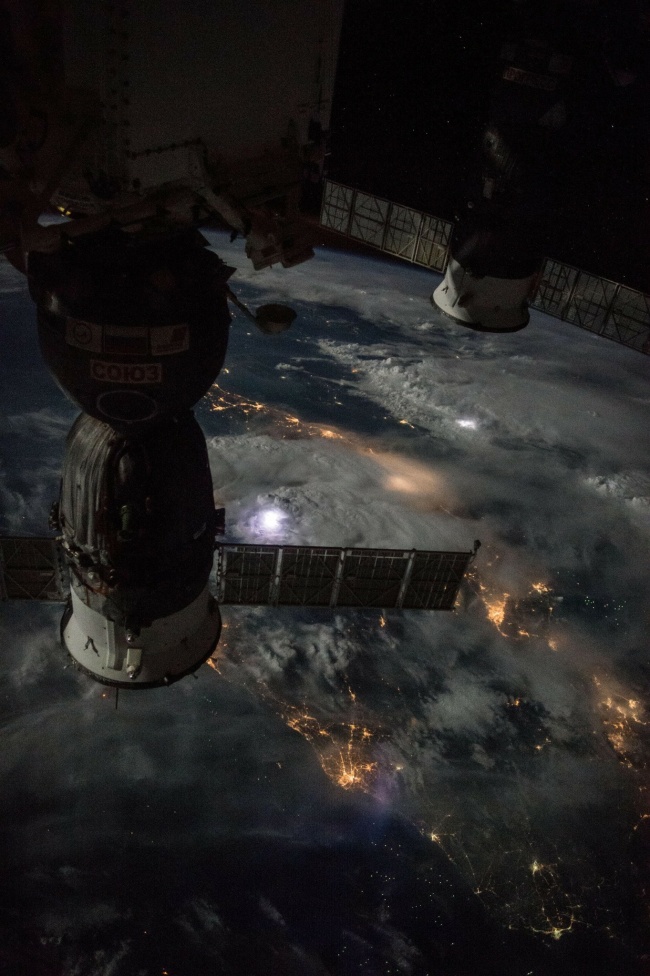 The International Space Station flying over a thunderstorm