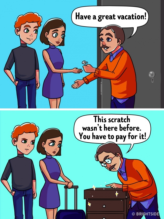 Sometimes tourists prefer not to stay in hotels but to rent apartments or even entire houses. There is a high probability that the owner of the property will try to make you pay a huge additional charge for “damaging property.”