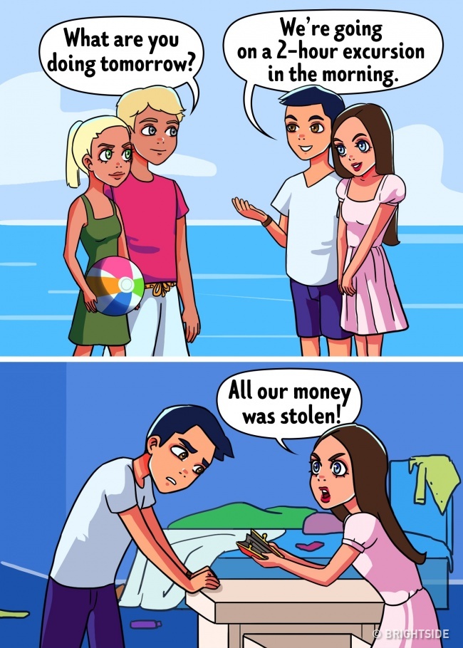 This method is very common in warmer countries where tourists live not in the main building of the hotel but in bungalows. Scammers get acquainted with you, and you have fun together for a few evenings. Then one day they will find out the exact time you will be away from your room, and they break in. As a result, you risk losing all your money and valuables.