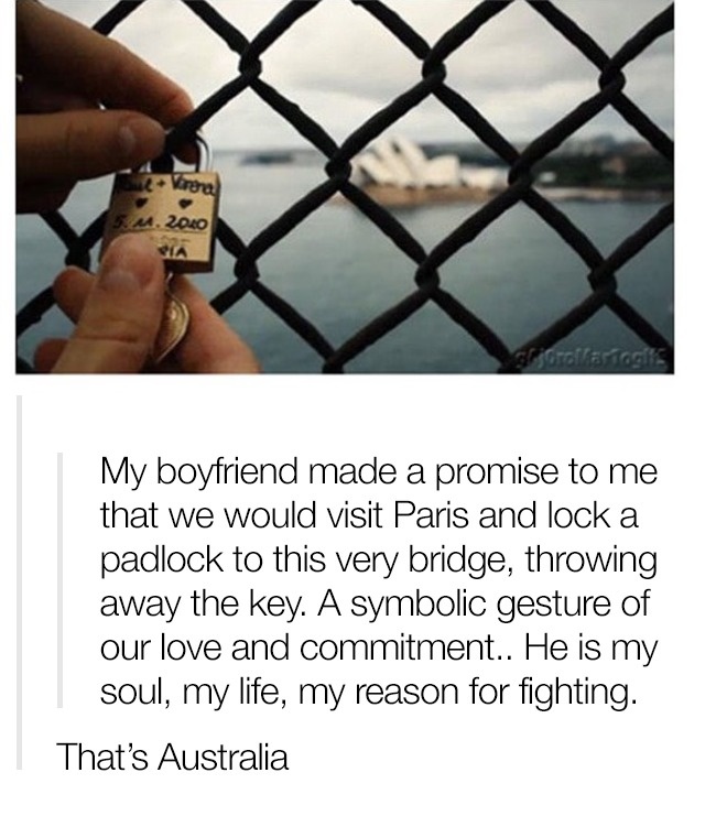 The definition of trust and true love: He took her to Sydney (Australia), but probably told her it was Paris. She believed him as her own symbolic gesture of love and commitment!