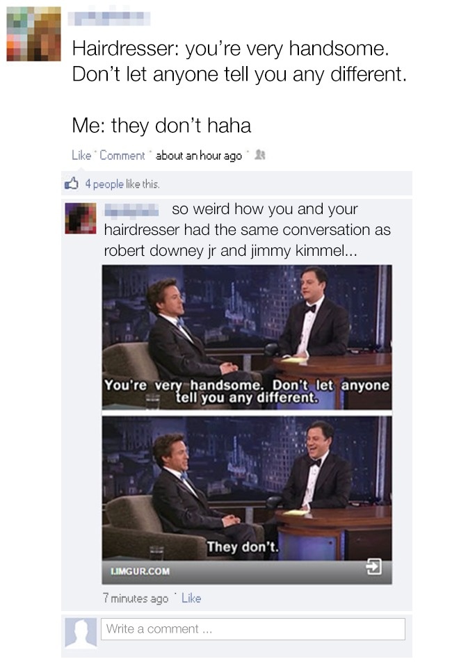 I thought I was special, but it turned out my hairdresser just tells this to everyone! Thank you for telling me the truth. My heart is broken and I’m getting a new hairdresser right away!