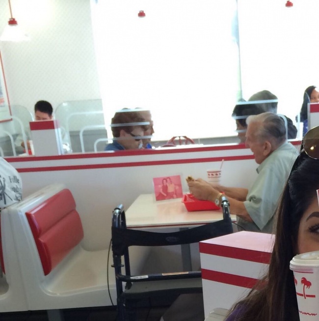 6. This elderly man is eating alone at a diner. His wife’s photo is next to him.