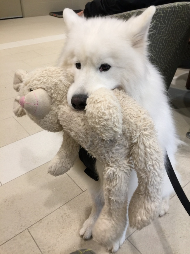 2. This brave dog is donating blood for a sick puppy. He is a little scared, so he took his favorite toy for support.