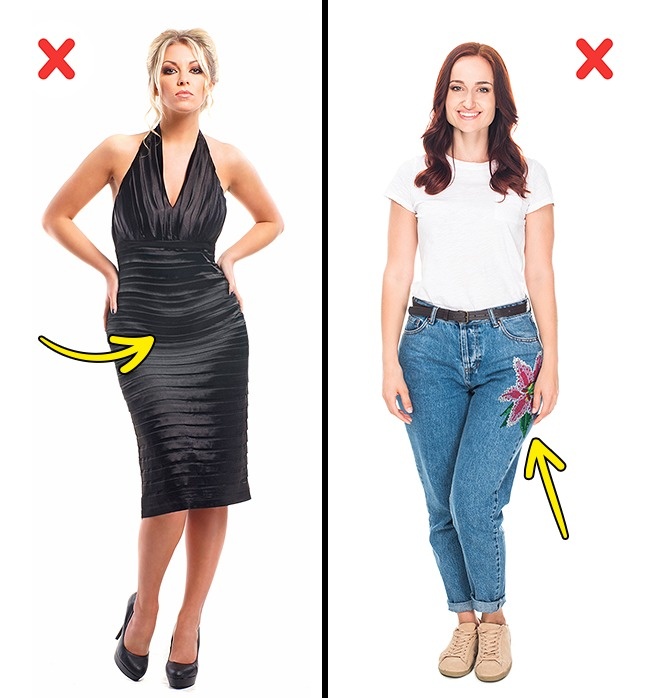 Don’t buy clothes made of rough materials or clothes that are too tight. Avoid square silhouettes and angular lines as they’ll only draw attention to any problem areas. To cover up any flaws, choose clothes made of smooth and flexible fabrics.