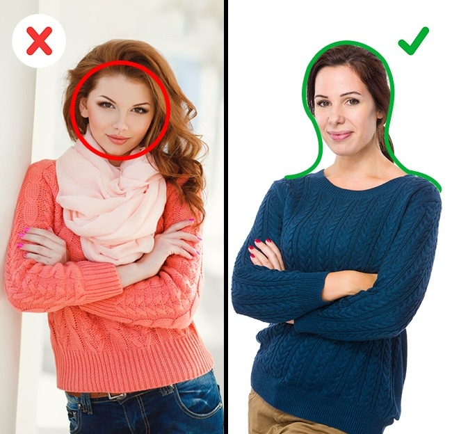 Tight scarves and turtlenecks can overburden your overall image. You can just put on a scarf and loosen it so as to be able to tuck it under a belt or a strap. Necklines that are round or V-shaped are the best choice. Also, leave 2-3 buttons unbuttoned near the neck zone.