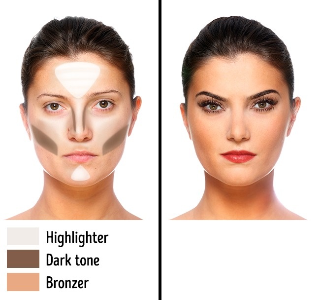 Contouring makes your face look more narrow and it can even hide a double chin. You just need to learn how to use dark and light tones correctly. The key rule to remember is to darken everything you want to hide, and to lighten everything you want to highlight.