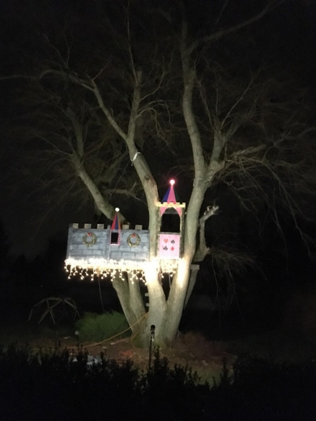 “My uncle built this amazing tree house for his kids and decorated it for Christmas.”