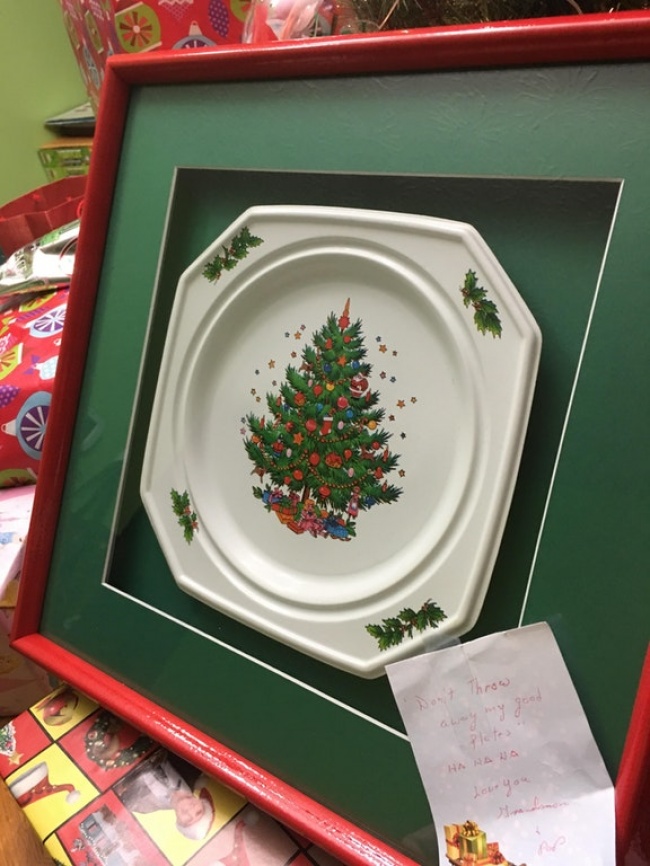 “For 30 years, my grandmother used the same plastic plates for Christmas. After last year, she only had 7 left, so she framed them and gave one to each of her 7 grandkids.”