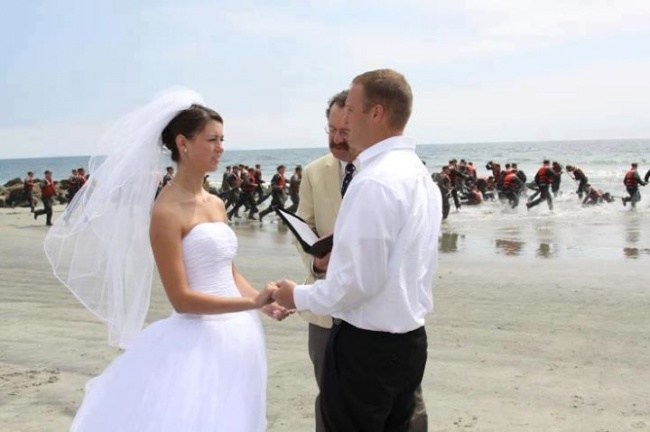 “A group of Navy SEALS accidentally photobombed some wedding pictures. Bride and groom don’t look too happy.”