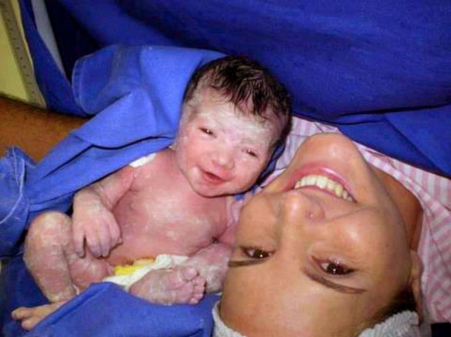 This baby is a natural-born photo model. He was inside a belly just a few seconds ago and now he’s already posing in front of the camera.