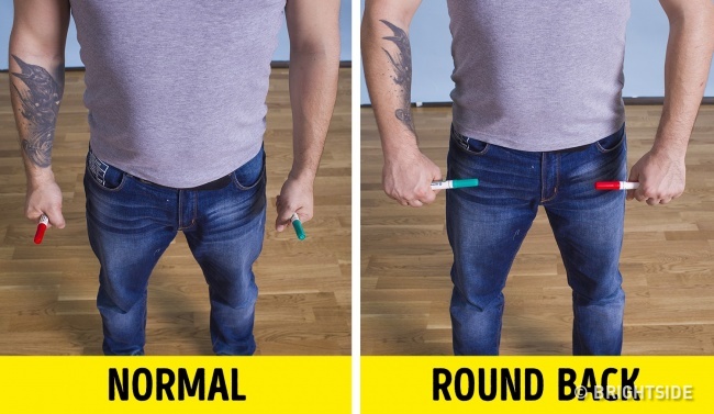 There is another simple test that can indicate that you have a rounded back. Take 2 pencils or pens in your hands and put your hands down alongside your body. If the pencils are parallel to each other, it means that your posture is fine. If the pencils point at each other, it means you have a rounded back.