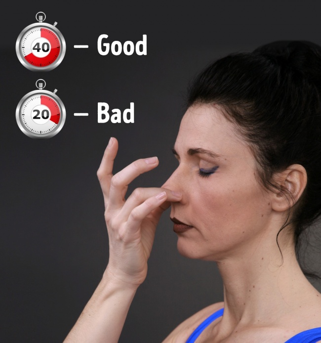 After 5 minutes, take a few deep breaths again and then hold your breath after you fully breathe out. A healthy person can spend 25-40 seconds like this. By the way, athletes have higher results, so using your result, you can estimate how trained your body is.