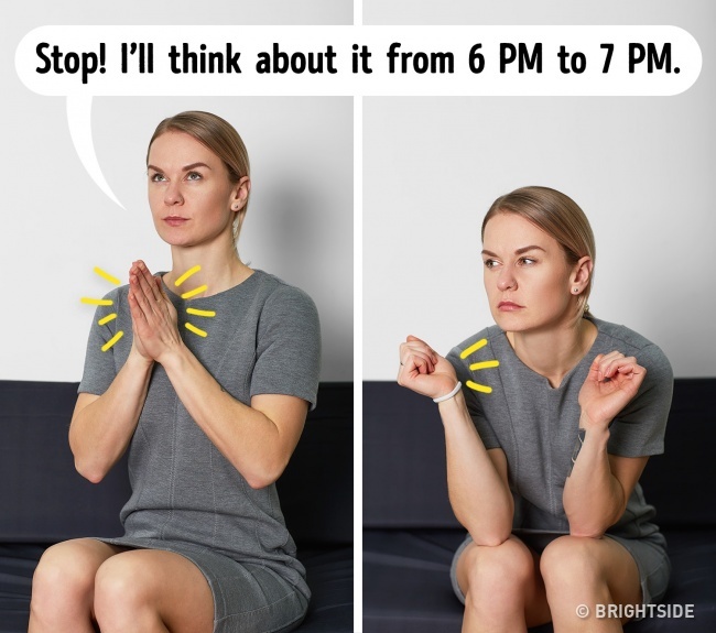 Clap your hands and scream, “Stop! I’ll think about it later!” You also can wear a band on your wrist and snap it or pinch yourself whenever you start thinking about something that isn’t benefiting you at that moment. Use such tricks to stop the cycle of thoughts and postpone a problem for a while. Then, try to switch your attention to an extraordinary object or an exercise.