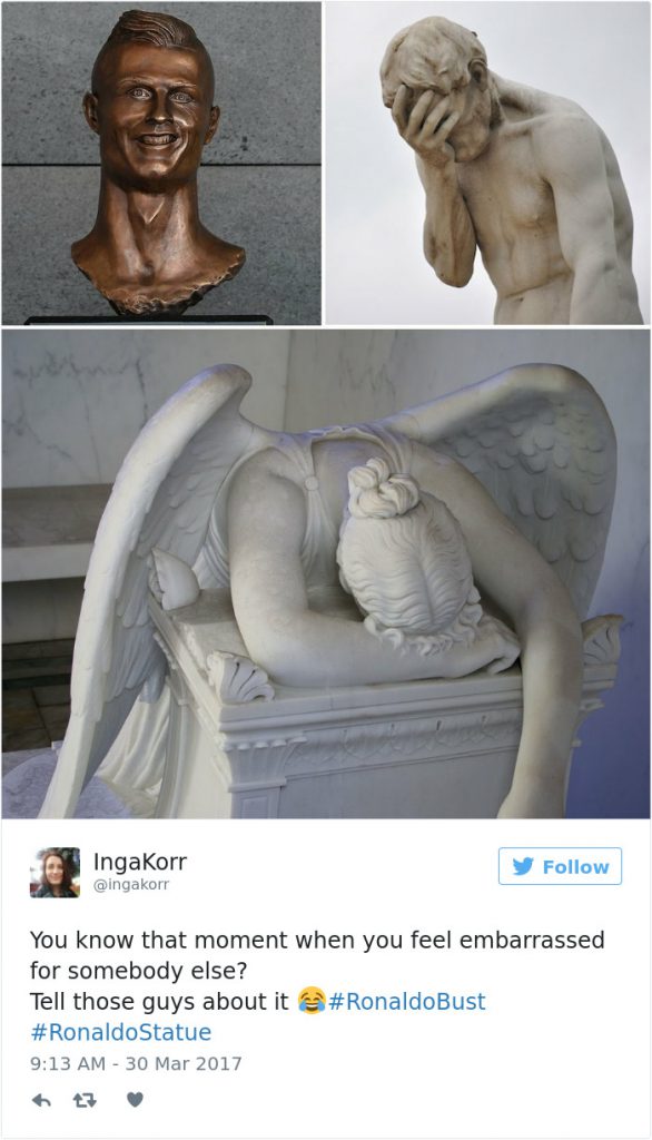 Cristiano Ronaldo is the world’s most famous athlete, and one of the handsomest as well. A bronze bust of him unveiled in his native Portugal on March 29th, however, is seriously creeping people out. Thankfully, the Internet quickly came to the rescue, and memes of the bust started falling from the sky like rain.Ronaldo is viewed as a hero in his hometown of Funchal, located on the Madeira Islands of Portugal. The city decided to honor him by renaming their local airport the Cristiano Ronaldo Madeira International Airport, but the bust of him they unveiled at the rebranding ceremony was definitely less than honorable. The startling statue is causing online reactions from horror to hilarity, and the memes it has inspired are likely to outlive the legacy of Ronnie himself.It’s been said that Ronaldo was dubbed ‘cry baby’ by his childhood playmates due to his emotional responses to failure. We can only imagine how he’s feeling now.