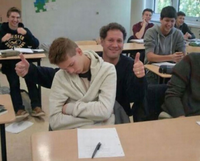 The teacher neither woke up the sleeping student nor criticized him, but he kept the class’ spirits high.