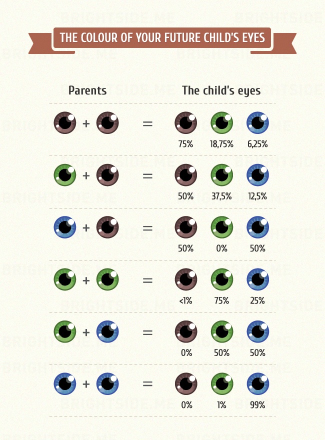 So here’s a rough guide which will help you find out whether your children are going to be blue-eyed, brown-haired, have a big nose or a small one, as well as plenty of other things. Literally anyone can use this and make a good guess about the appearance of their future sons and daughters. Fascinating!