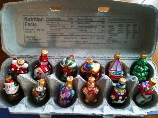 An egg carton can become a great home for Christmas toys when they’re not hanging on the tree.