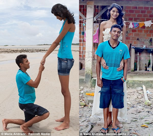 Brazil’s tallest teenager is set to become the world’s tallest bride after her 5’4” tall boyfriend proposed to her during a walk along the beach. 18-year-old aspiring model Elisany da Cruz Silva, who stands 6’9” tall has been dating 23-year-old Francinaldo da Silva Carvalho for more than three years. Despite the foot and a half difference in their height, Francinaldo and Elisany are ready to beat the odds!